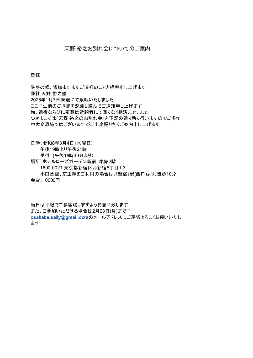 Continue Reading弊社サイトをご覧の皆様 厳冬の候、皆様ますますご清祥のことと拝察申し上げます弊社 天野 裕之儀2026年1月7日56歳にて永眠いたしました 。ここに生前のご厚誼を深謝し謹んでご通知申し上げます 。尚、通夜ならびに密葬は近 […]